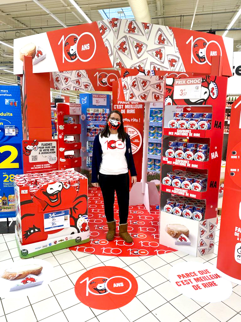 Pour activer la marque jurassienne, nous avons développé des shop in shop en carton massifs et attractifs déployés à l’entrée des magasins ou en allée centrale pour une théâtralisation premium retraçant l’histoire de la Vache qui rit. Des animations pensées pour les familles avec une mascotte et une animatrice formée au discours de la marque.