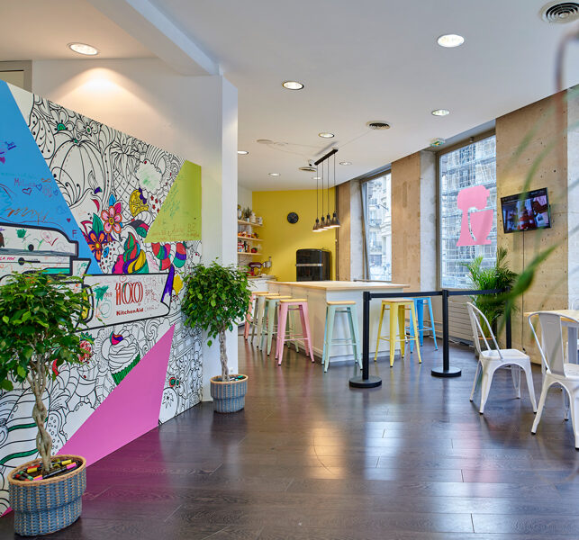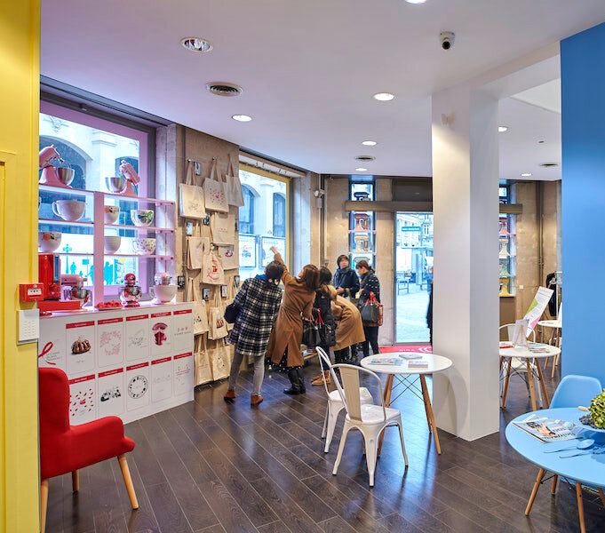 Différents espaces ont été conçus pour accueillir un salon de thé, une librairie gourmande et un corner d’expositions et de vente de produits. Un système de commande via tablette avec des promotions exclusives a été mis en place pour booster les ventes. Les visiteurs sont également invités à tester les produits et à personnaliser des tote-bags.