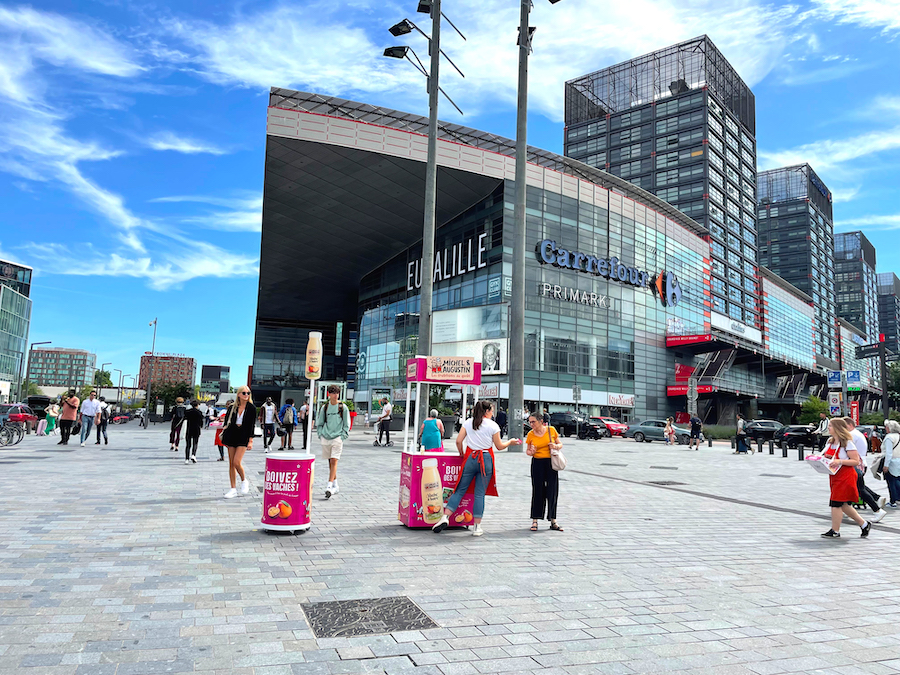 Un caisson bar de type « push-car », équipé d’un bac réfrigéré, assure un maintien au froid des produits. Un chariot-tube, encore plus tactique, permet de graviter autour du dispositif et assure davantage d’autonomie et de visibilité pour cette campagne sampling en street marketing.