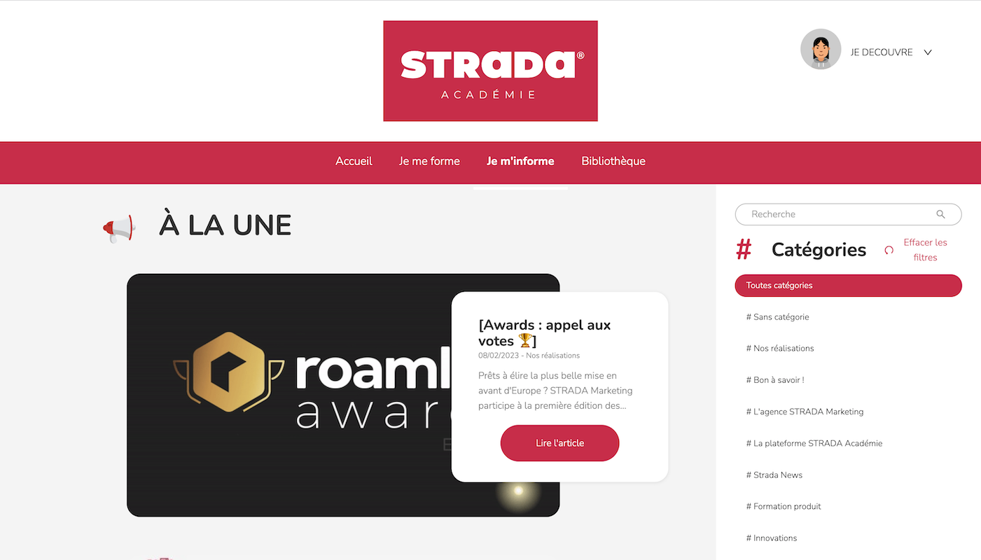 Face à ce constat, notre agence de marketing opérationnel lance son nouveau dispositif de formation, nommé « Strada Académie » : véritable innovation dans le secteur, cette plateforme interne s’adresse à tous les experts de la relation commerciale, quel que soit leur métier et leur niveau de formation initiale. Un outil innovant et technologique dispensant tous les savoirs nécessaires à l’exercice des métiers de la force de vente, de la promotion des ventes, de l’animation commerciale ou encore de l’optimisation de linéaire.